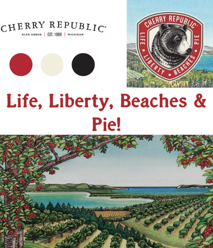 Cherry Republic was founded in Glen Arbor Michigan in 1989, with a total of only six locations, all within the state of Michigan. They sell a variety of souvenir-type products (t-shirts, mugs, tote bags, etc.), marketing themselves to a small crowd the tourists of Northern Michigan. The last brand update was in 2014.